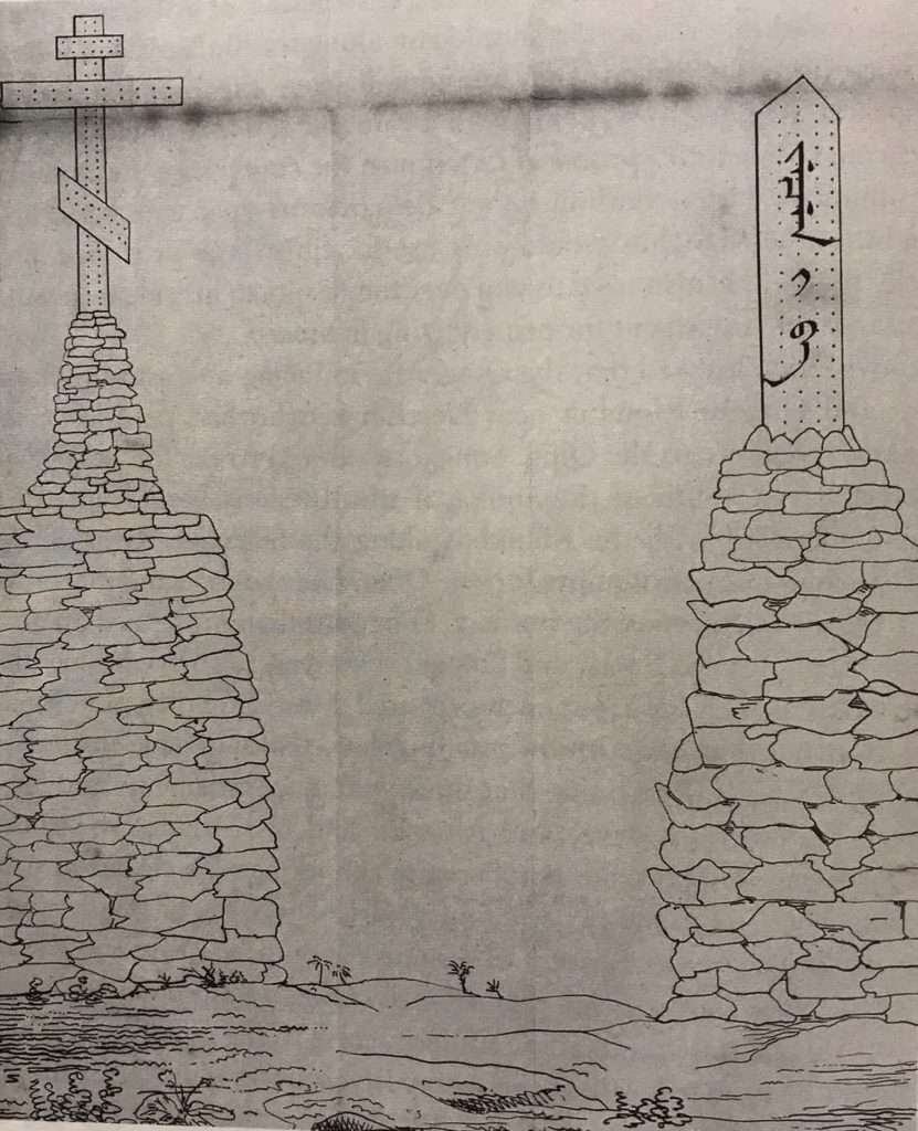 A depiction of stone markers erected on the boundary between the Russian and Manchu empires that resulted from the Treaty of Nerchinsk. The left marker features a Russian Orthodox cross, while the inscription on the right pillar reads “border” in Manchu.12