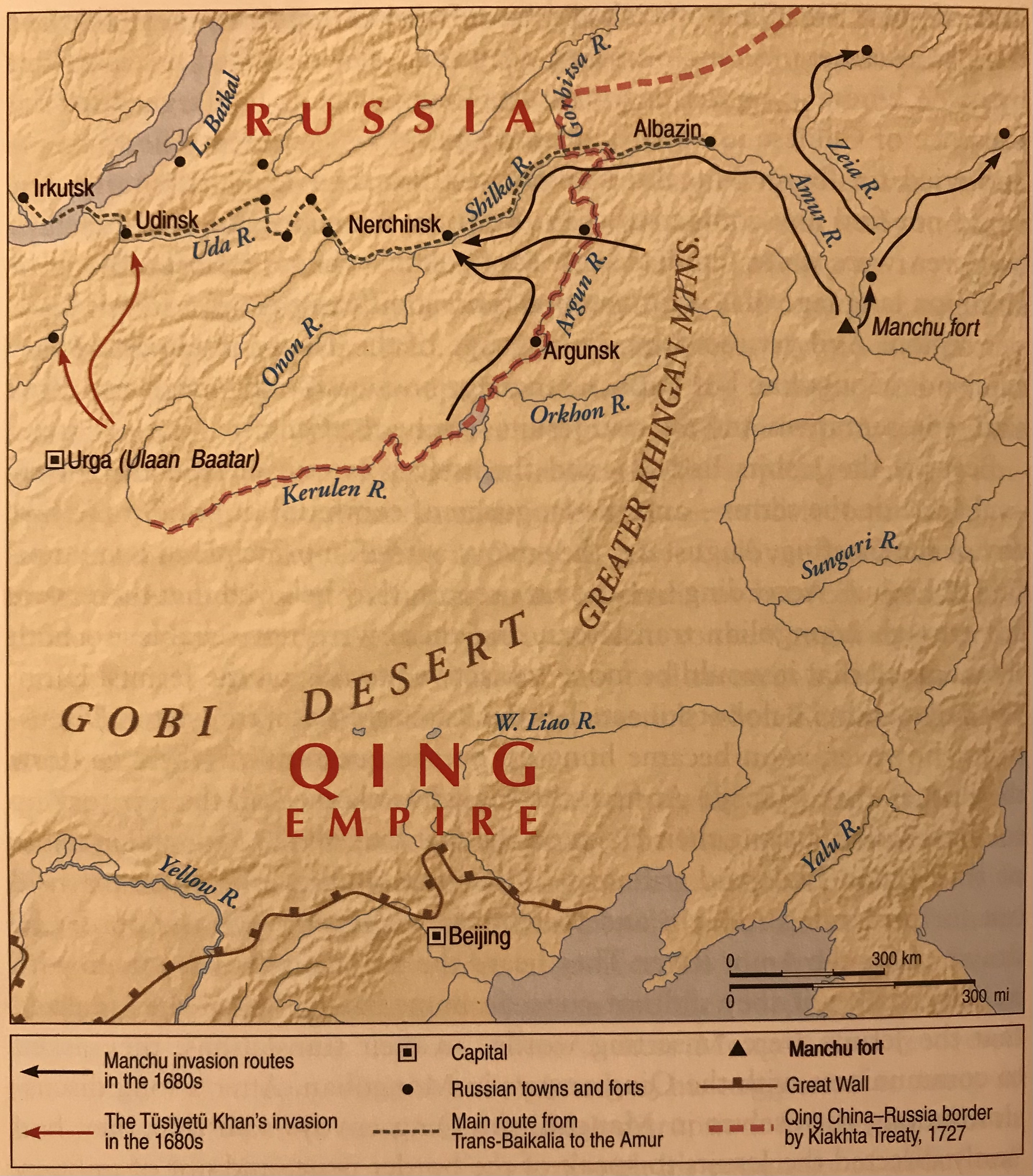 In the late 1690s, Galdan Khan’s forces were defeated by the Qing Empire, effectively consolidating Manchu control of Mongolia. With the resulting relative peace, the Qing again turned their attention to trade relations with the Russians. While Moscow sent plenipotentiaries to the Qing imperial capital at Peking in spring of 1727, the topography of the frontier in question was so unknown to both parties that the negotiations had to be conducted at Selenginsk, a Russian settlement east of Lake Baikal. While this lack of knowledge does demonstrate a certain amount of disregard for the inhabitants of the region, there was one Mongol that participated in the negotiations. However, he was an ethnically Khalkh prince who had married into the Qing royal family, and therefore argued on behalf of Manchu interests instead of those of the local Mongol groups.13 This does explain why the border portions of the treaty were written in “Russian, Manchu, and Mongol languages.”14