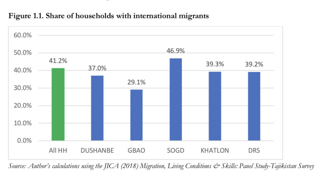 ADB states that in 2019, Tajikistan received $2.7 billion in remittance, equivalent to 33.4% of gross domestic product (GDP.) Reflecting on De Haas’s theory of push and pull factor, this report supports the idea by stating that the “Tajik economy is not creating enough jobs for its rapidly growing labor force. Every year about half a million Tajiks leave the country for overseas employment, the majority of them male (85.5% in 2019) and short-term seasonal migrants (75%)” with Russia being the most popular destination. These numbers are a strong indication of the fact that the country will continue to rely on migration.